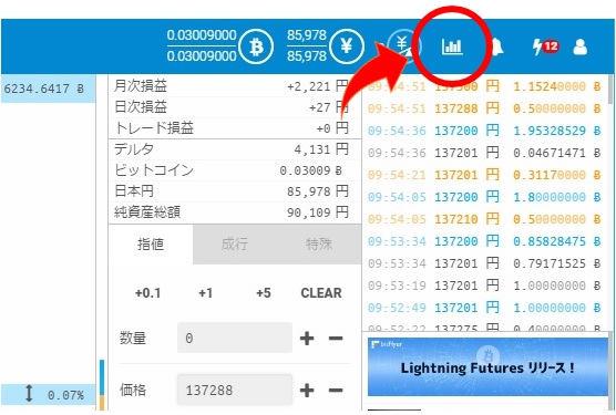 ビットフライヤーにログインしたら、左側のメニューから「bitFlyer Lightning」をクリックします。