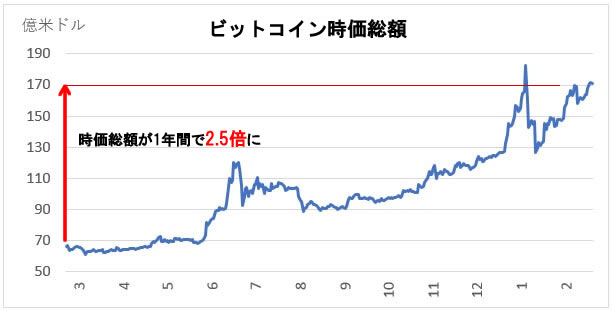 日本株全体とビットコインを比較してしまうと、ビットコインの時価総額は誤差のような小さい金額になってしまいます。このような小さな時価総額の銘柄(ビットコイン)をめぐって、世界中で取引されているということになります。